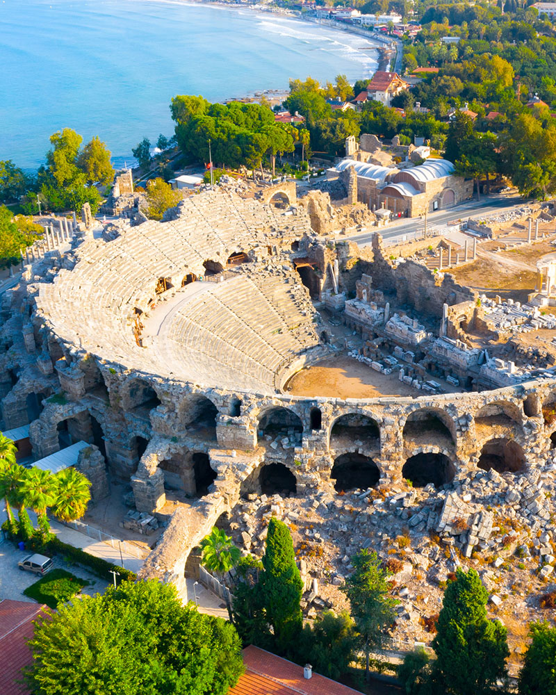 Today, Side is a blend of old and new: well-preserved ancient ruins (temples, theaters, streets, harbor area) exist along with a lively seaside town / harbour area.